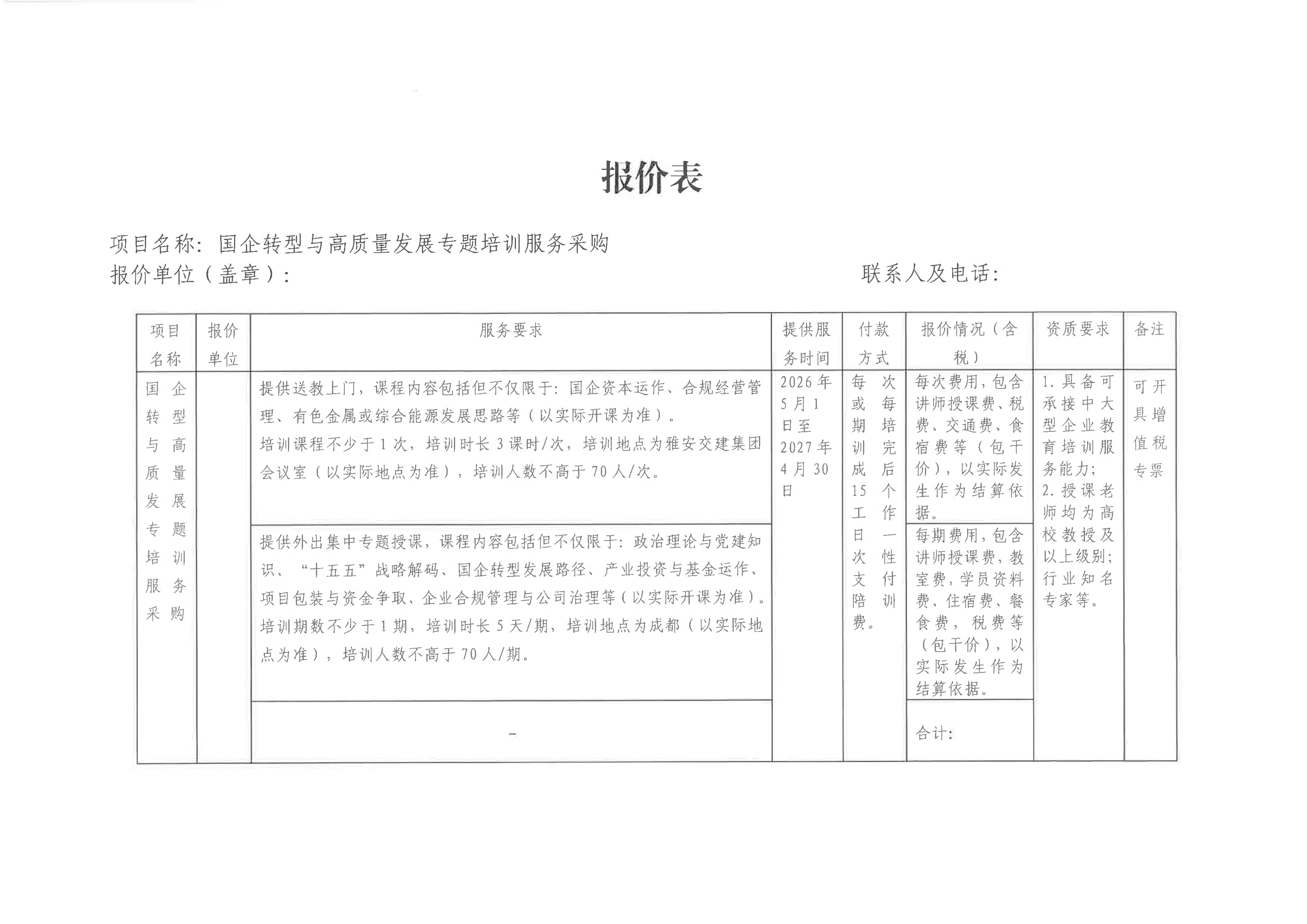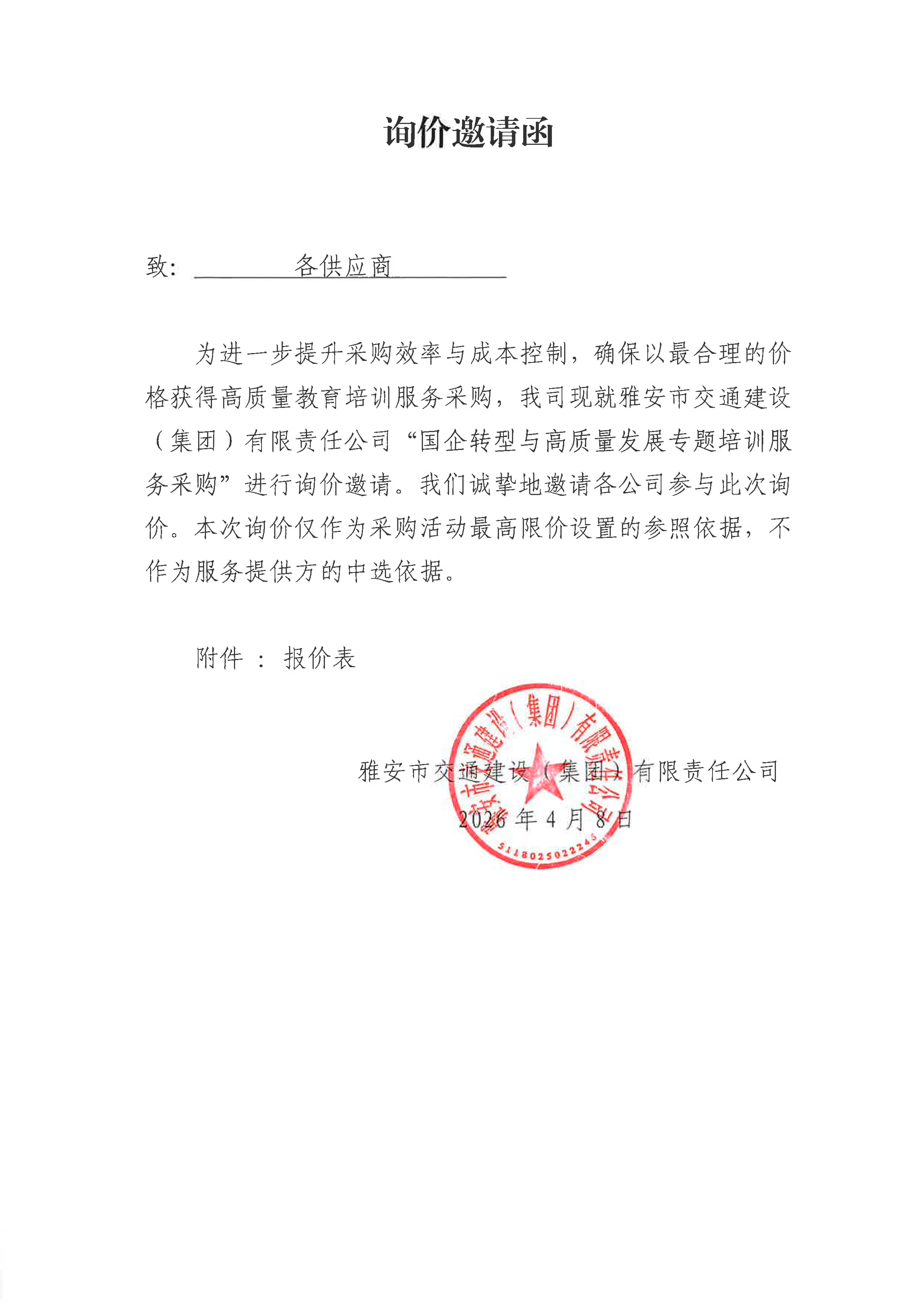 關(guān)于雅安市交通建設(shè)(集團(tuán))有限責(zé)任公司國企轉(zhuǎn)型與高質(zhì)量發(fā)展專題培訓(xùn)服務(wù)采購限價的詢價函