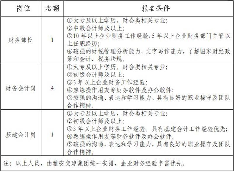 根據(jù)發(fā)展需要,決定面向社會公開招聘雅安市交通建設(shè)(集團)有限責(zé)任公司(以下簡稱“雅安交建集團”)所屬子公司財務(wù)部門負責(zé)人1名,工作人員5名,現(xiàn)將有關(guān)事項公告如下: