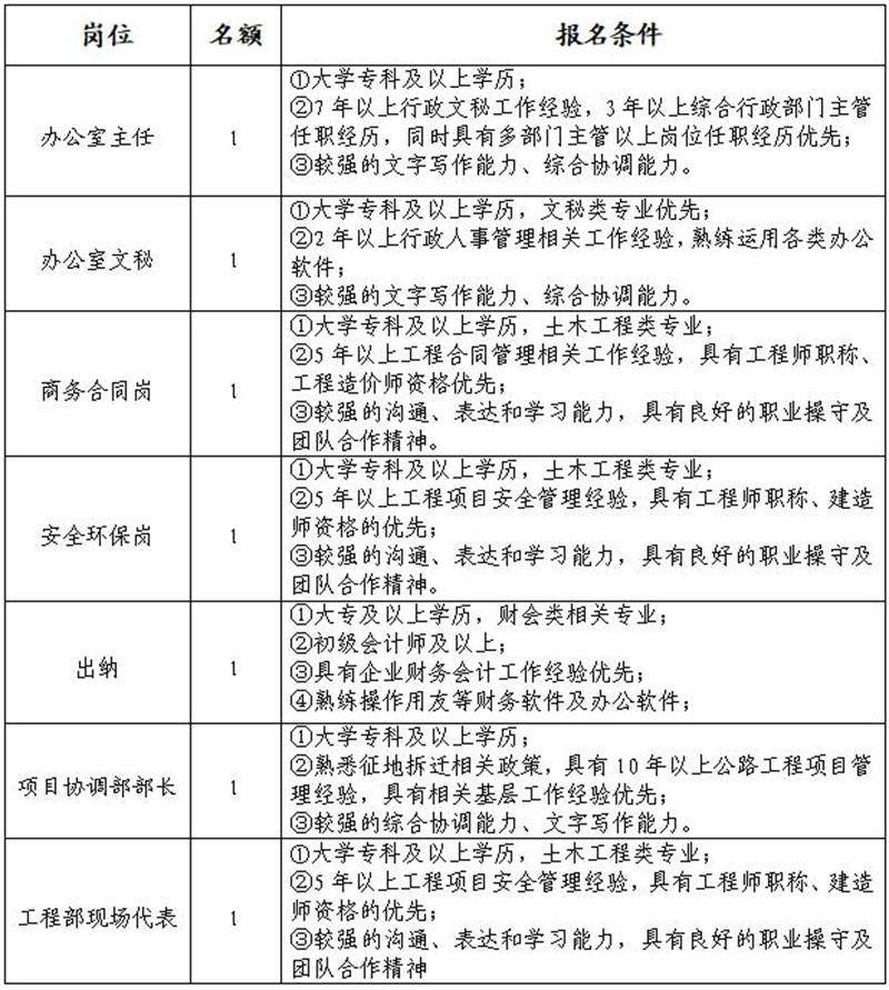 雅安交建集團(tuán)資產(chǎn)經(jīng)營(yíng)管理有限公司是雅安市重點(diǎn)國(guó)有企業(yè)雅安市交建集團(tuán)下屬子公司,主要從事企業(yè)資產(chǎn)經(jīng)營(yíng)管理;項(xiàng)目投資;土地整理等業(yè)務(wù)。根據(jù)公司發(fā)展需要,決定面向社會(huì)公開招聘7名工作人員,現(xiàn)將有關(guān)事項(xiàng)公告如下: