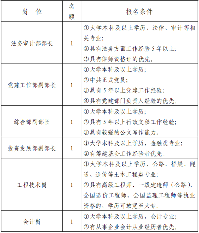 雅安市交建集團(tuán)是市屬重點(diǎn)國有企業(yè),主要從事交通基礎(chǔ)設(shè)施及配套服務(wù)設(shè)施的投資、建設(shè)、經(jīng)營和交通資源的開發(fā)利用等業(yè)務(wù)。根據(jù)公司發(fā)展需要,決定面向社會公開招聘6名工作人員,現(xiàn)將有關(guān)事項(xiàng)公告如下: