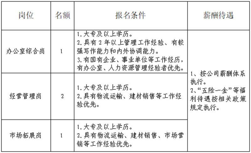 雅安交建集團運通貿(mào)易有限公司是雅安市交通建設(集團)有限責任公司下屬子公司。主要從事普通貨運、建材銷售、供應鏈管理、貨運代理、貨運信息咨詢服務、倉儲配送服務等工作,F(xiàn)根據(jù)公司業(yè)務發(fā)展需要,決定招聘4名工作人員,現(xiàn)將有關事項公告如下: