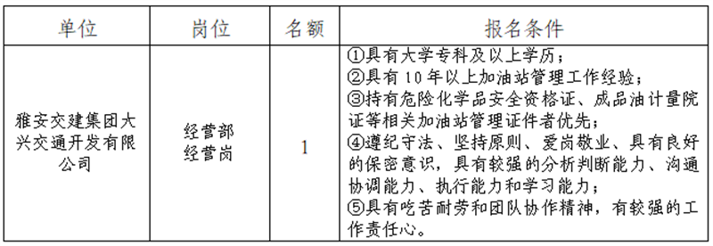 根據(jù)發(fā)展需要,決定面向社會(huì)公開(kāi)招聘雅安市交通建設(shè)(集團(tuán))有限責(zé)任公司(以下簡(jiǎn)稱(chēng)“雅安交建集團(tuán)”)所屬子公司工作人員1名,現(xiàn)將有關(guān)事項(xiàng)公告如下: