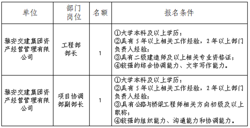 根據(jù)發(fā)展需要,決定面向社會(huì)公開(kāi)招聘雅安市交通建設(shè)(集團(tuán))有限責(zé)任公司(以下簡(jiǎn)稱(chēng)“雅安交建集團(tuán)”)所屬子公司工作人員2名,現(xiàn)將有關(guān)事項(xiàng)公告如下: