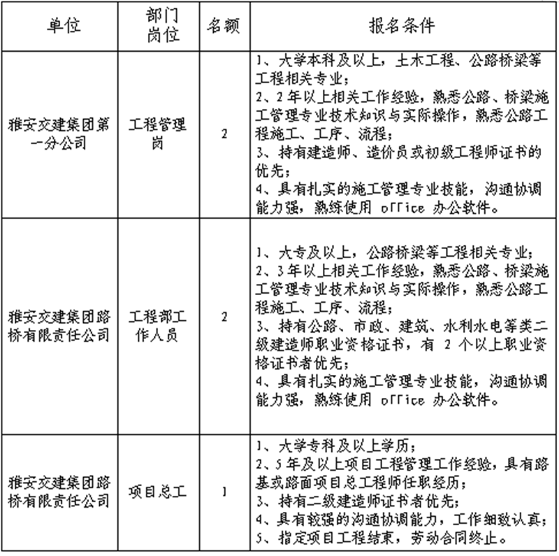 根據(jù)發(fā)展需要,決定面向社會(huì)公開招聘雅安市交通建設(shè)(集團(tuán))有限責(zé)任公司(以下簡稱“雅安交建集團(tuán)”)所屬分子公司工作人員5名,現(xiàn)將有關(guān)事項(xiàng)公告如下: