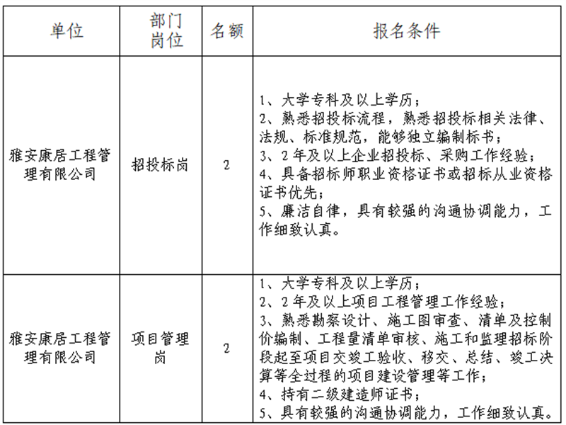 根據(jù)發(fā)展需要,決定面向社會公開招聘雅安市交通建設(集團)有限責任公司(以下簡稱“雅安交建集團”)所屬子公司工作人員4名,現(xiàn)將有關事項公告如下: