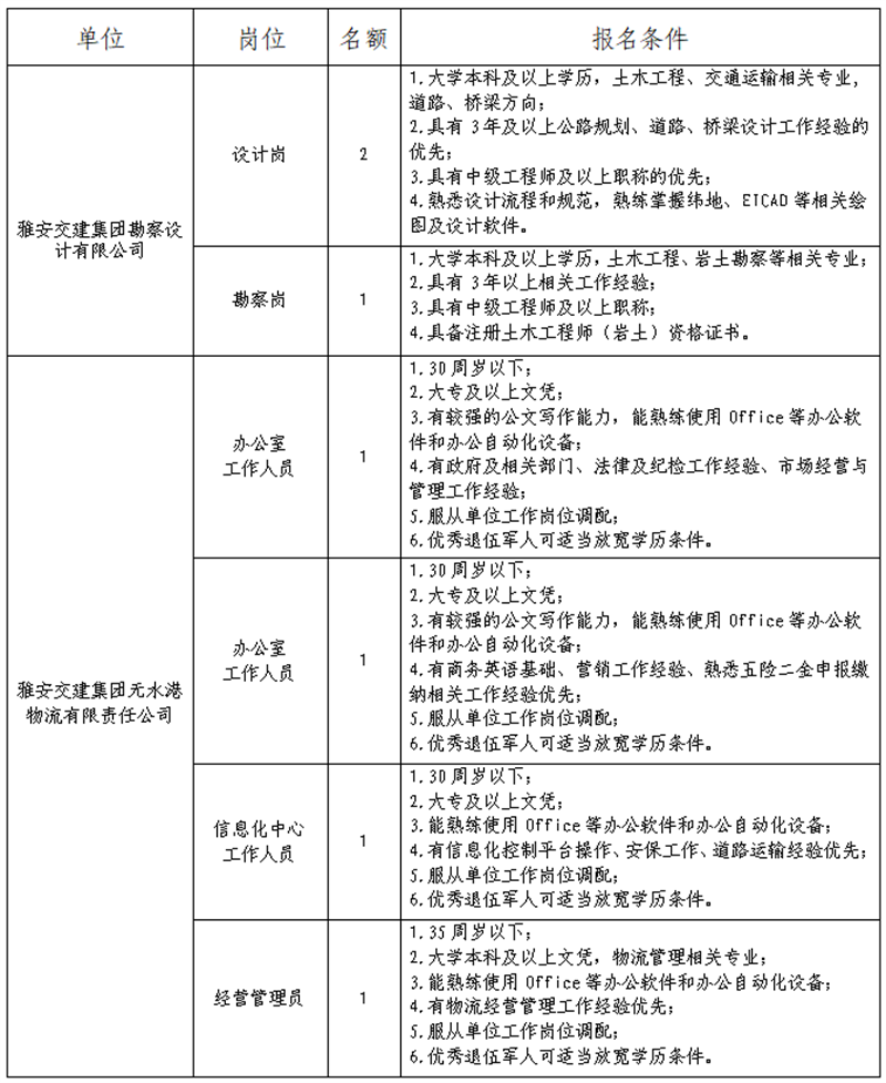 根據(jù)發(fā)展需要,決定面向社會(huì)公開(kāi)招聘雅安市交通建設(shè)(集團(tuán))有限責(zé)任公司(以下簡(jiǎn)稱(chēng)“雅安交建集團(tuán)”)所屬子公司工作人員7名,現(xiàn)將有關(guān)事項(xiàng)公告如下: