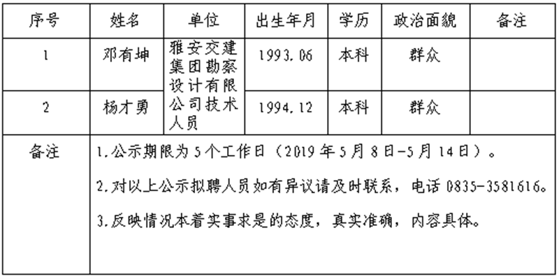 雅安交建集團(tuán)子公司擬聘用人員公示(勘察設(shè)計(jì)公司)