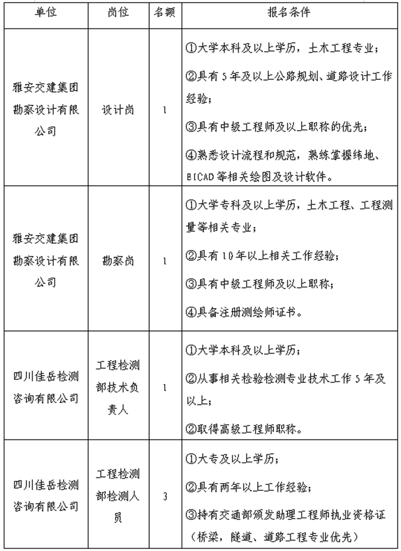 根據(jù)發(fā)展需要,決定面向社會公開招聘雅安市交通建設(shè)(集團)有限責任公司(以下簡稱“雅安交建集團”)所屬子公司工作人員6名,現(xiàn)將有關(guān)事項公告如下: