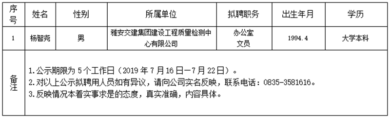 雅安交建集團子公司擬聘用人員公示(工程質量檢測中心)