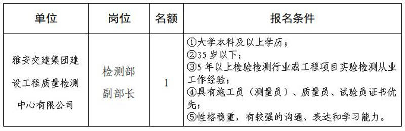 根據(jù)發(fā)展需要,決定面向社會公開招聘雅安市交通建設(shè)(集團(tuán))有限責(zé)任公司(以下簡稱“雅安交建集團(tuán)”)所屬子公司中層干部1名,現(xiàn)將有關(guān)事項公告如下: