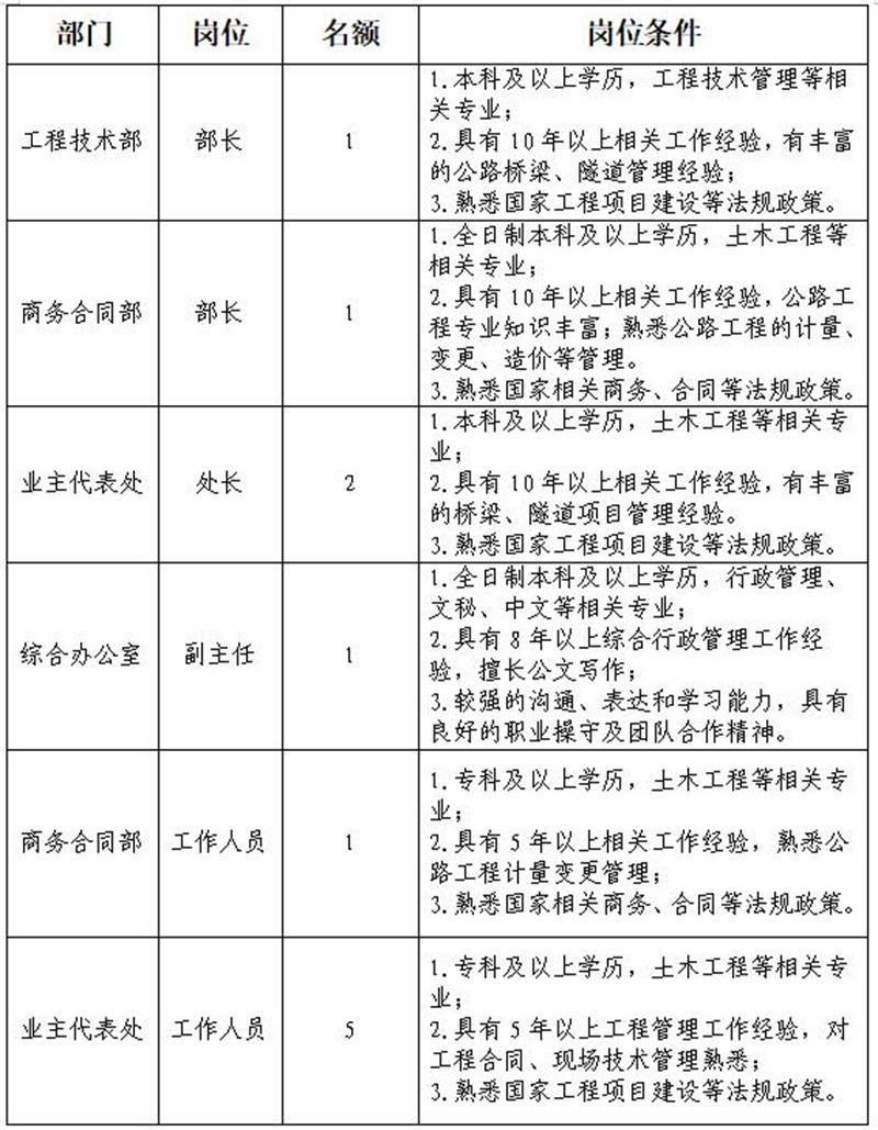 根據(jù)發(fā)展需要,決定面向社會公開招聘雅安市交通建設(集團)有限責任公司(以下簡稱“雅安交建集團”)所屬子公司管理人員及工作人員共計11名,現(xiàn)將有關(guān)事項公告如下: