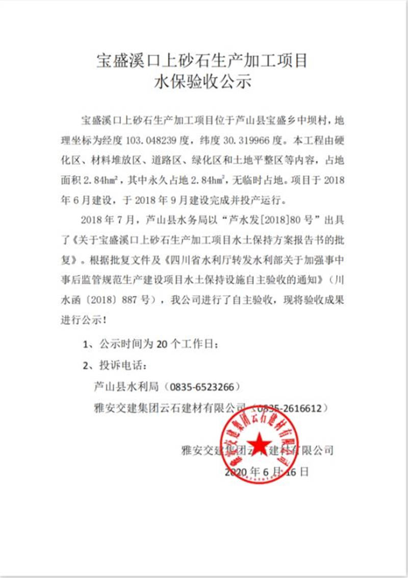 寶盛溪口上砂石生產(chǎn)加工項(xiàng)目水保驗(yàn)收公示