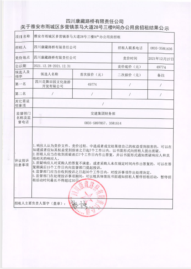 四川康藏路橋有限責(zé)任公司關(guān)于雅安市雨城區(qū)多營(yíng)鎮(zhèn)茶馬大道28號(hào)三樓9間辦公用房招租結(jié)果的公示
