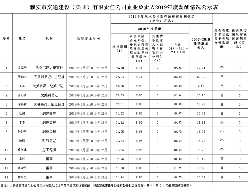 雅安市交通建設(shè)(集團(tuán))有限責(zé)任公司企業(yè)負(fù)責(zé)人2019年度薪酬情況公示表
