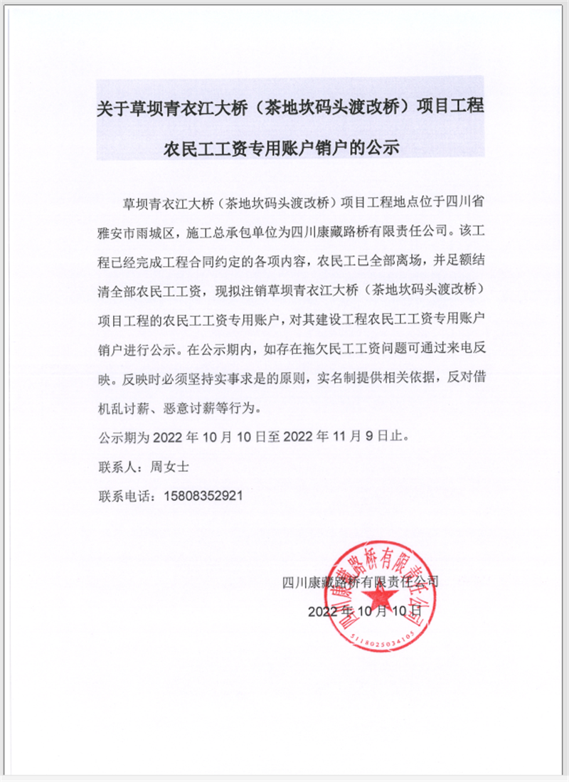 關(guān)于草壩青衣江大橋(茶地坎碼頭渡改橋)項(xiàng)目工程農(nóng)民工工資專用賬戶銷戶的公告