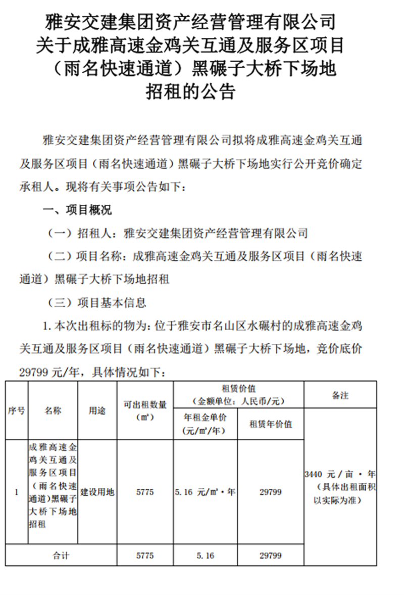 關(guān)于成雅高速金雞關(guān)互通及服務區(qū)項目(雨名快速通道)黑碾子大橋下場地招租的公告