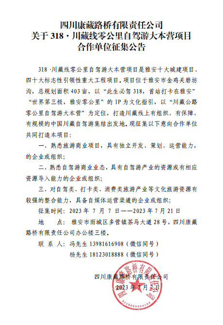 四川康藏路橋有限責(zé)任公司關(guān)于318.自駕大本營合作單位征集公告