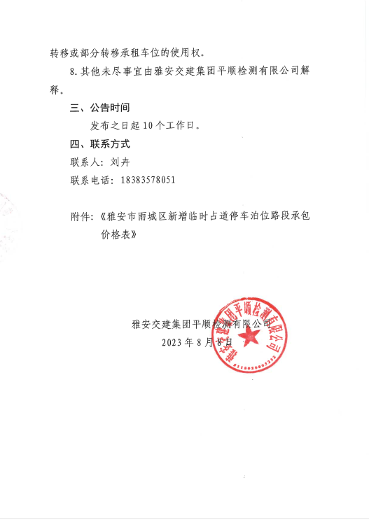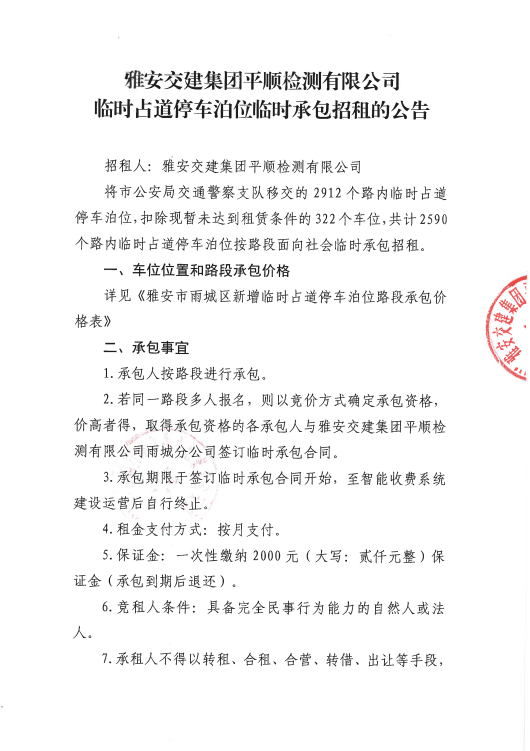 雅安交建集團(tuán)平順檢測(cè)有限公司臨時(shí)占道停車(chē)泊位臨時(shí)承包招租的公告