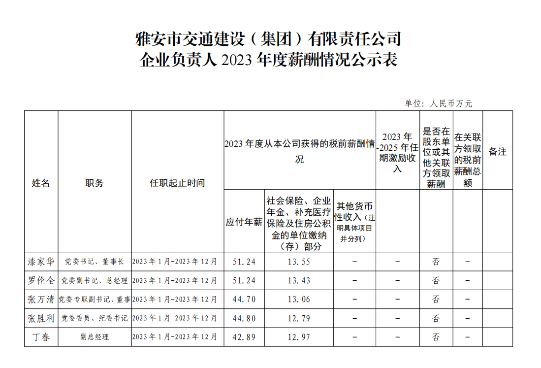雅安市交通建設(shè)(集團(tuán))有限責(zé)任公司 企業(yè)負(fù)責(zé)人2023年度薪酬情況公示表