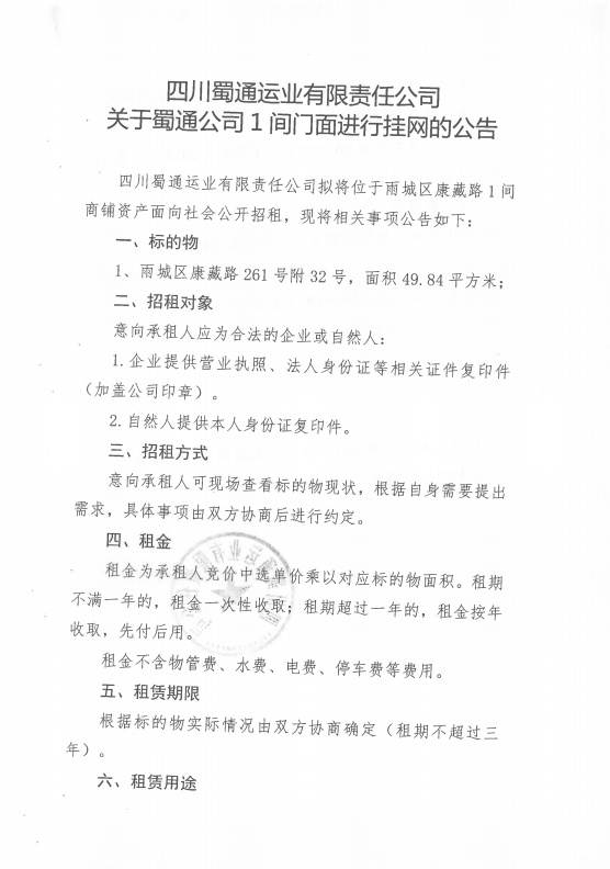 四川蜀通運業(yè)有限責(zé)任公司關(guān)于蜀通公司1間門面進(jìn)行掛網(wǎng)的公告