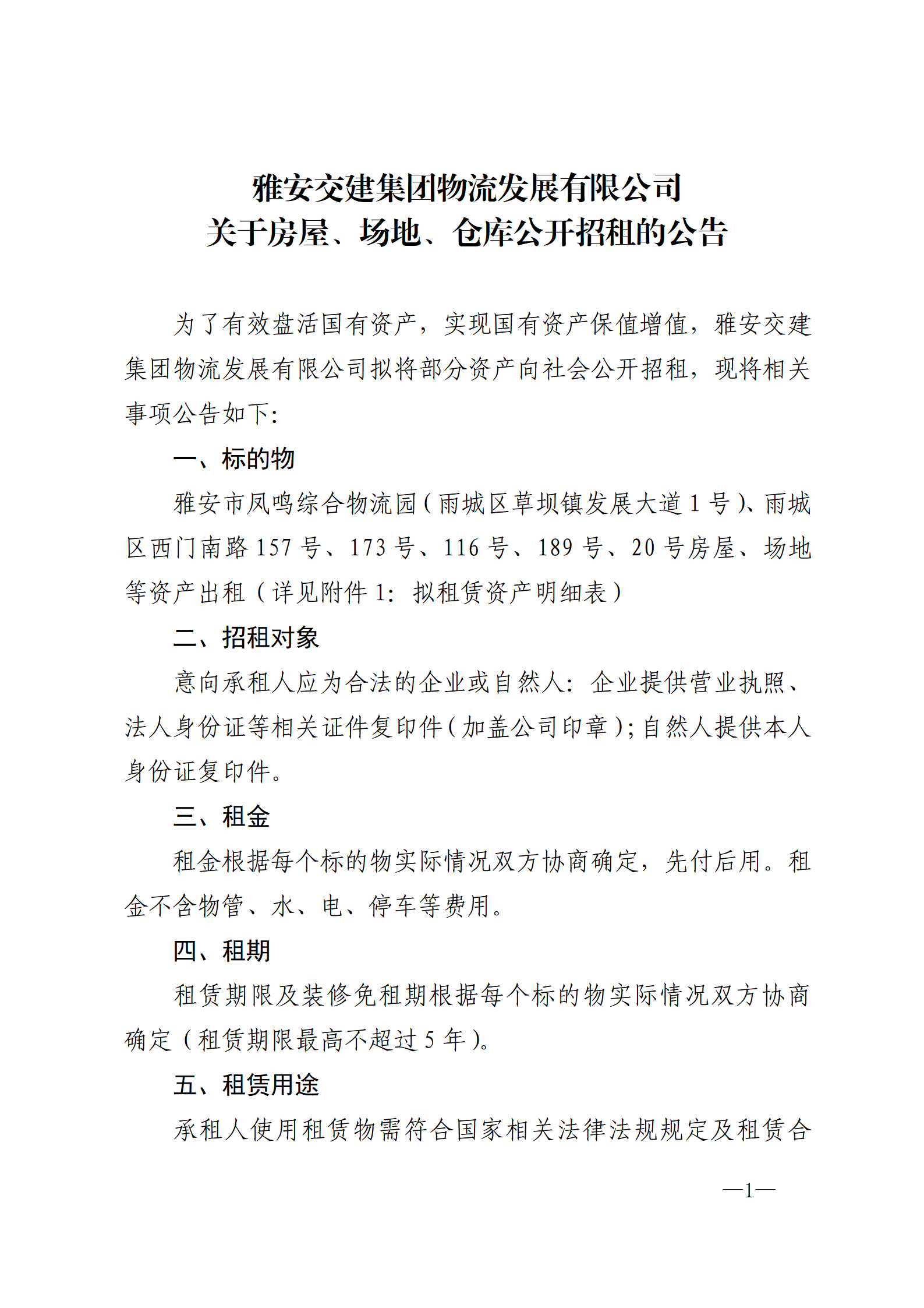 雅安交建集團(tuán)物流發(fā)展有限公司 關(guān)于房屋、場地、倉庫公開招租的公告