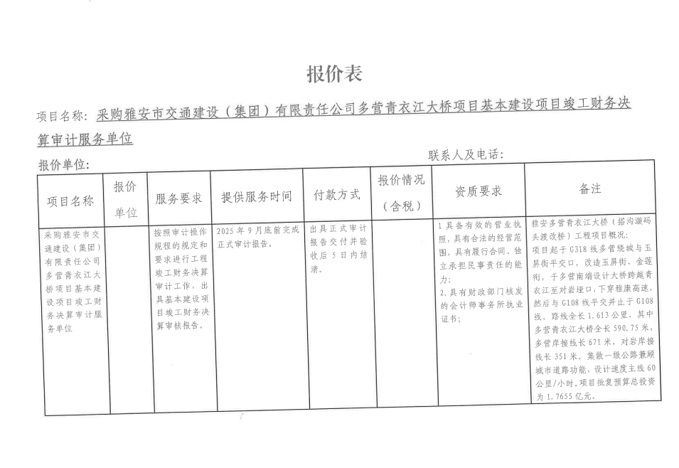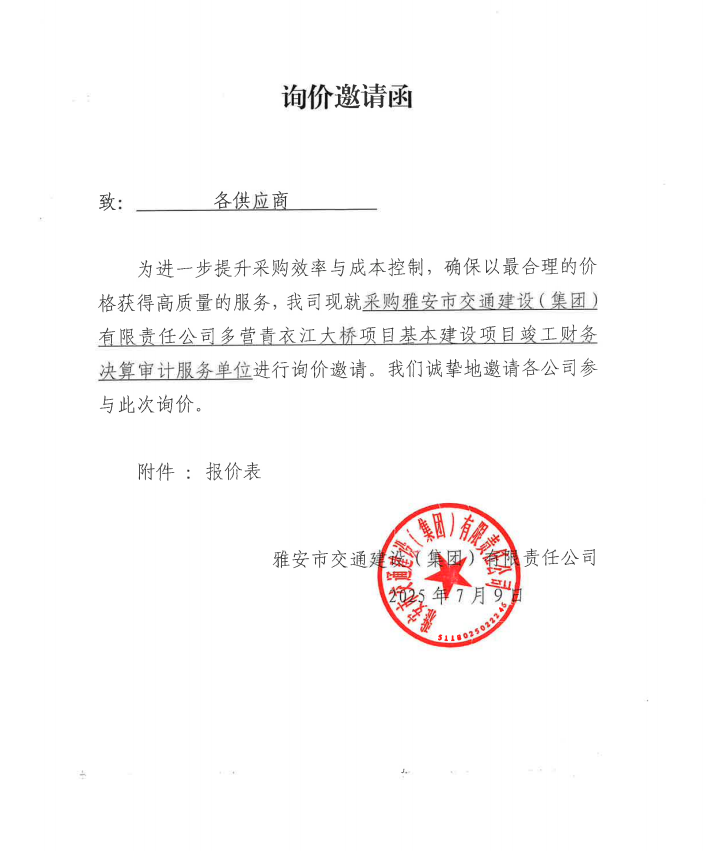 詢價邀請函——采購雅安市交通建設(shè)(集團(tuán))有限責(zé)任公司多營青衣江大橋項(xiàng)目基本建設(shè)項(xiàng)目竣工財(cái)務(wù)決算審計(jì)服務(wù)單位