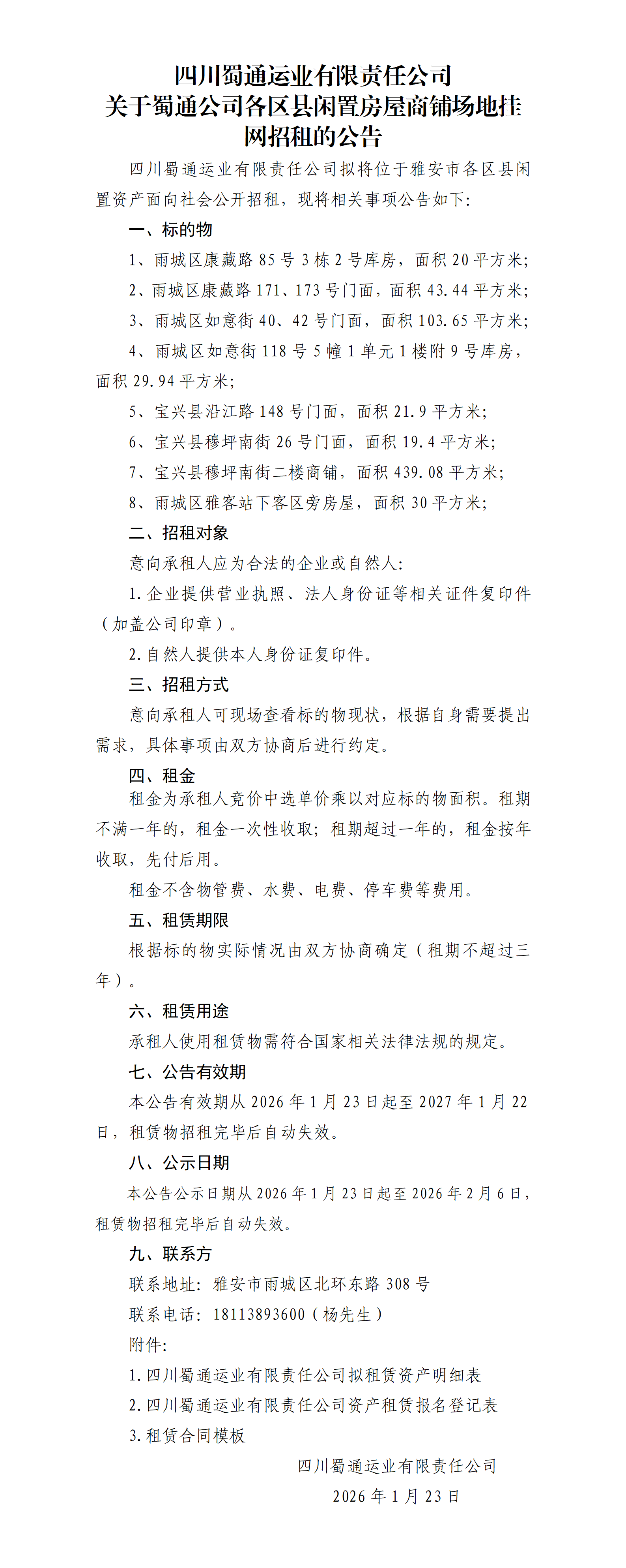 四川蜀通運業(yè)有限責(zé)任公司關(guān)于蜀通公司各區(qū)縣閑置房屋商鋪場地掛網(wǎng)招租的公告