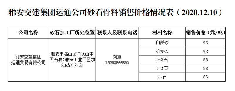 ÑŰ²½»½¨¼¯ˆF(tu¨¢n)ß\(y¨´n)ͨ¹«Ë¾É°Ê¯¹ÇÁÏäNÊÛƒr(ji¨¤)¸ñÇé›r±í£¨2020.12.10£©