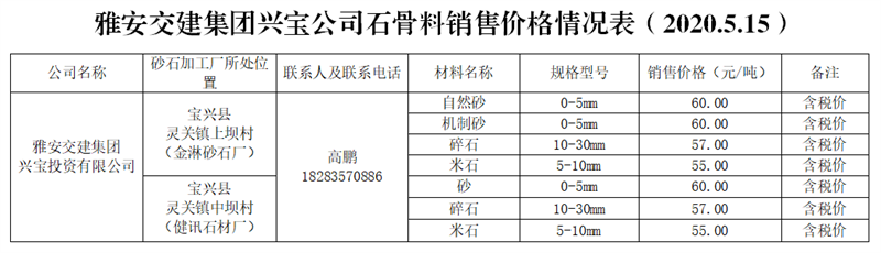 興寶投資有限公司。興寶公司是寶興縣人民政府指定寶興縣發(fā)展投資有限責任公司與雅安市交通建設(shè)(集團)有限責任公司共同組建的合資公司。目前,公司與兩家企業(yè)確定了代加工合作關(guān)系:一是寶興縣健迅石材廠;二是寶興縣金淋砂石有限公司;預計年生產(chǎn)能力約200萬噸。生產(chǎn)廠區(qū)距雨城區(qū)中心城區(qū)約55公里。