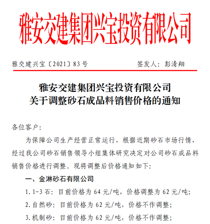 雅安交建集團(tuán)興寶公司關(guān)于調(diào)整成品料銷售價格的通知(2021.11.2)