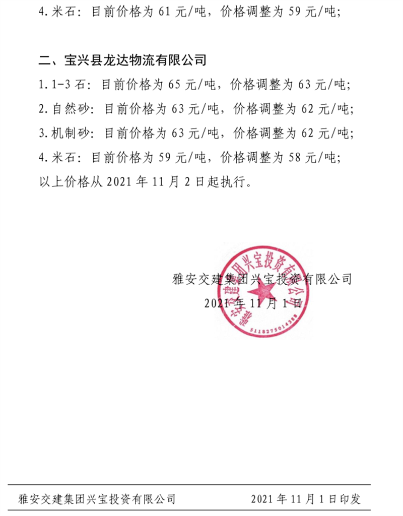 雅安交建集團(tuán)興寶公司關(guān)于調(diào)整成品料銷售價格的通知(2021.11.2)