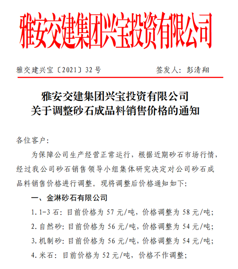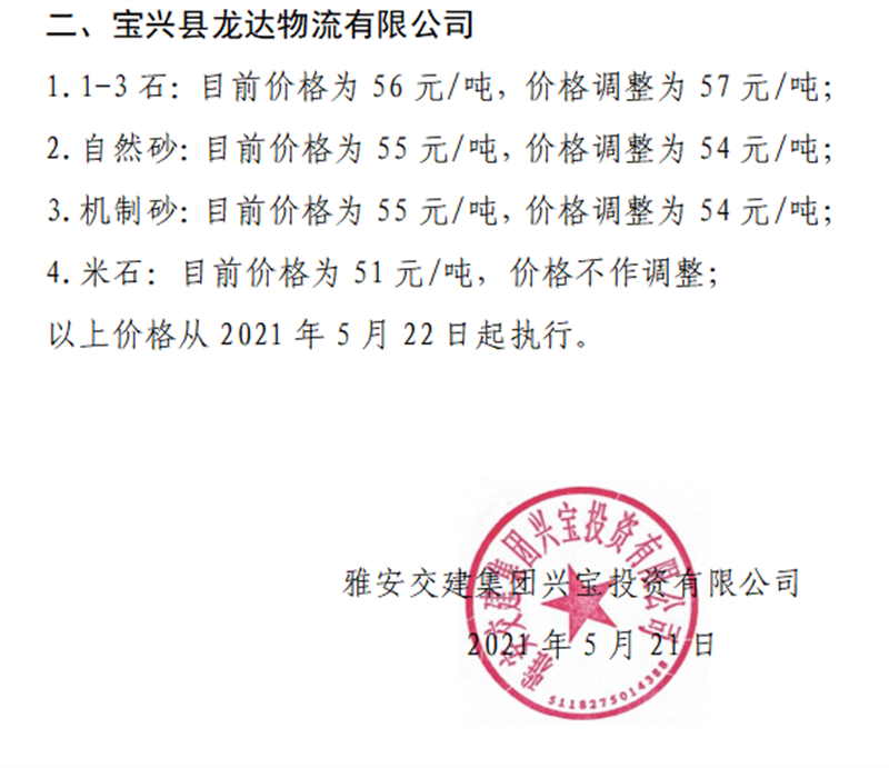雅安交建集團(tuán)興寶公司砂石骨料銷(xiāo)售價(jià)格情況表(2021.5.22)