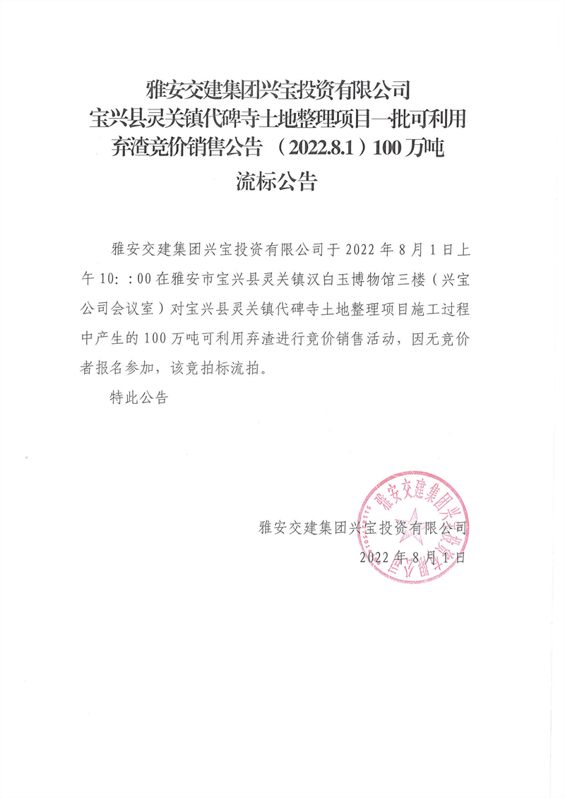 雅安交建集團興寶投資有限公司靈關(guān)鎮(zhèn)代碑寺土地整理項目100萬噸可利用棄渣競價銷售流標公告(2022.8.1)