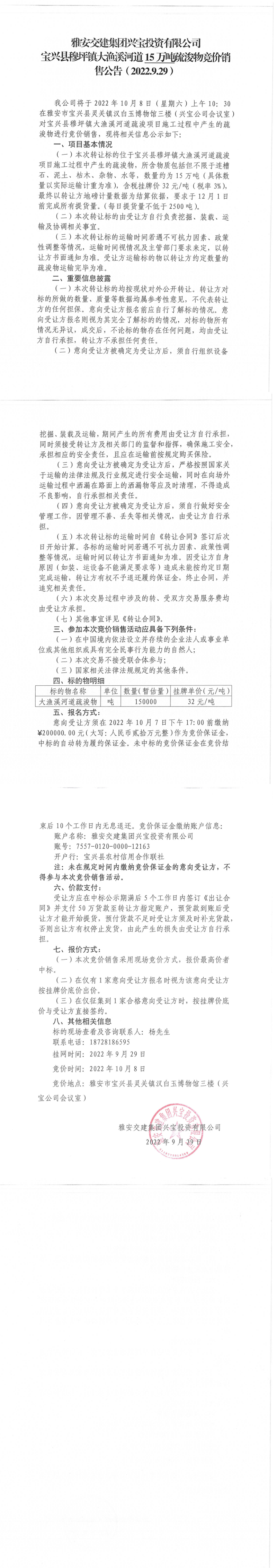 雅安交建集團(tuán)興寶投資有限公司寶興縣穆坪鎮(zhèn)大漁溪河道15萬噸疏浚物競(jìng)價(jià)銷售公告(2022.9.29)