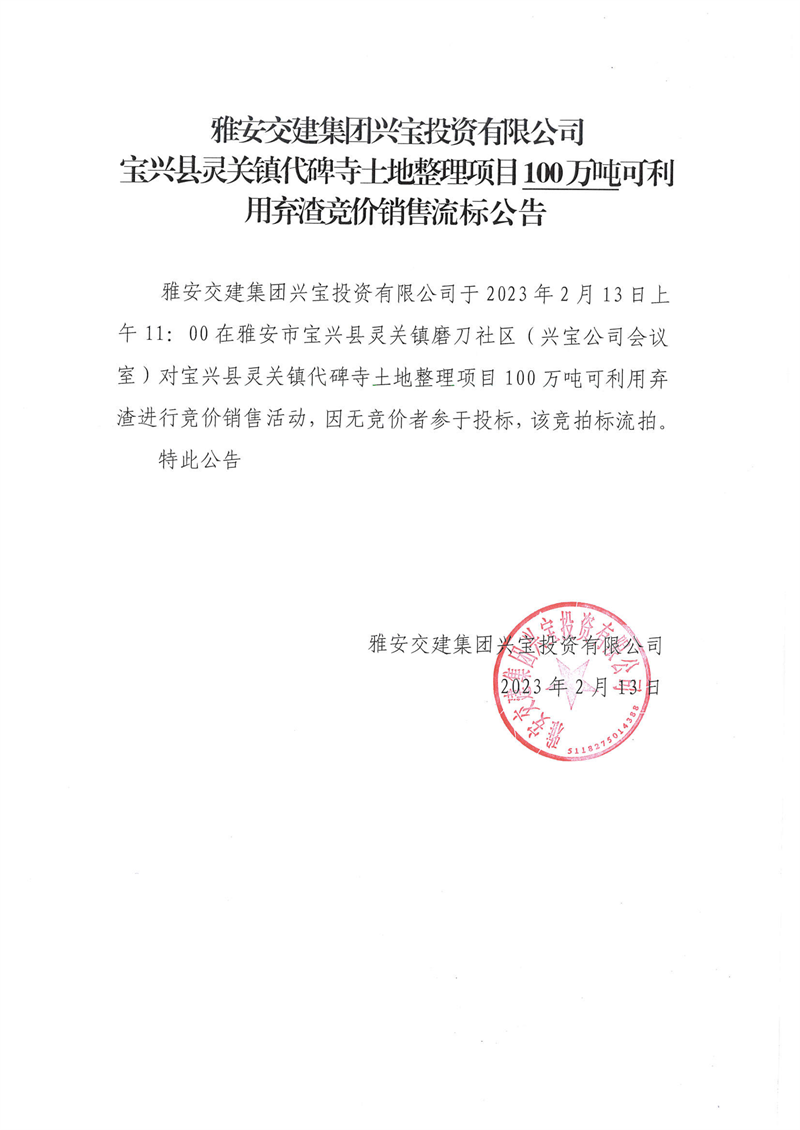 雅安交建集團(tuán)興寶投資有限公司100萬噸可利用棄渣競(jìng)價(jià)銷售流標(biāo)公告(2023.2.13)