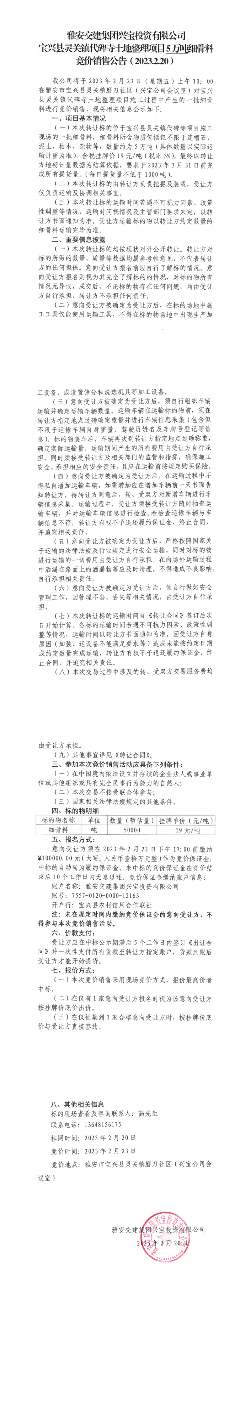 雅安交建集團(tuán)興寶投資有限公司寶興縣靈關(guān)鎮(zhèn)代碑寺土地整理項(xiàng)目5萬(wàn)噸細(xì)骨料競(jìng)價(jià)銷售公告(2023.2.20)