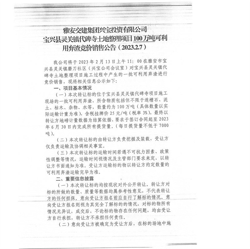 雅安交建集團興寶投資有限公司100萬噸可利用棄渣競價銷售流標(biāo)公告(2023.2.13)