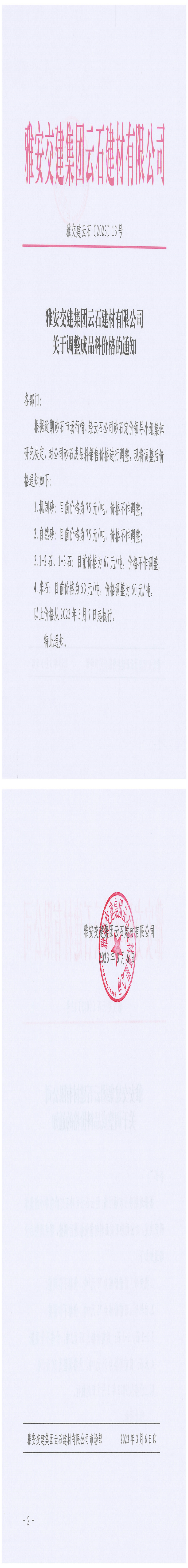 雅安交建集團(tuán)云石建材有限公司關(guān)于調(diào)整成品料價格的通知-2023-03-06