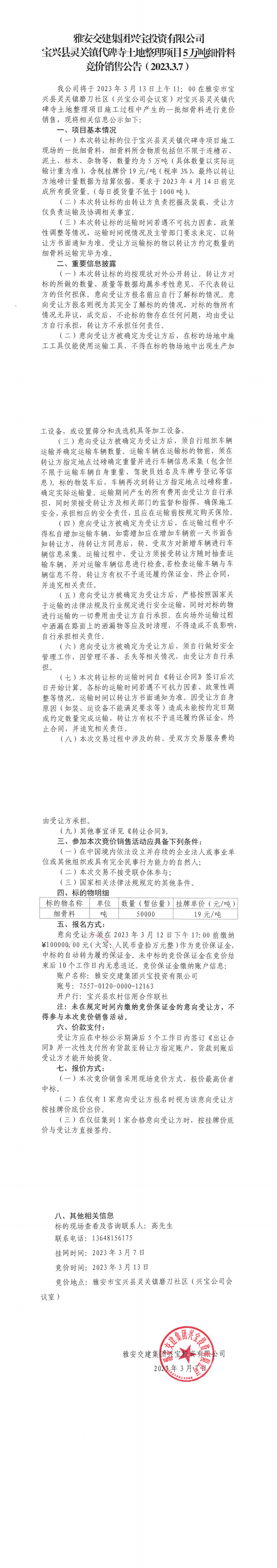 雅安交建集團(tuán)興寶投資有限公司寶興縣靈關(guān)鎮(zhèn)代碑寺土地整理項目5萬噸細(xì)骨料競價銷售公告(2023.3.7)