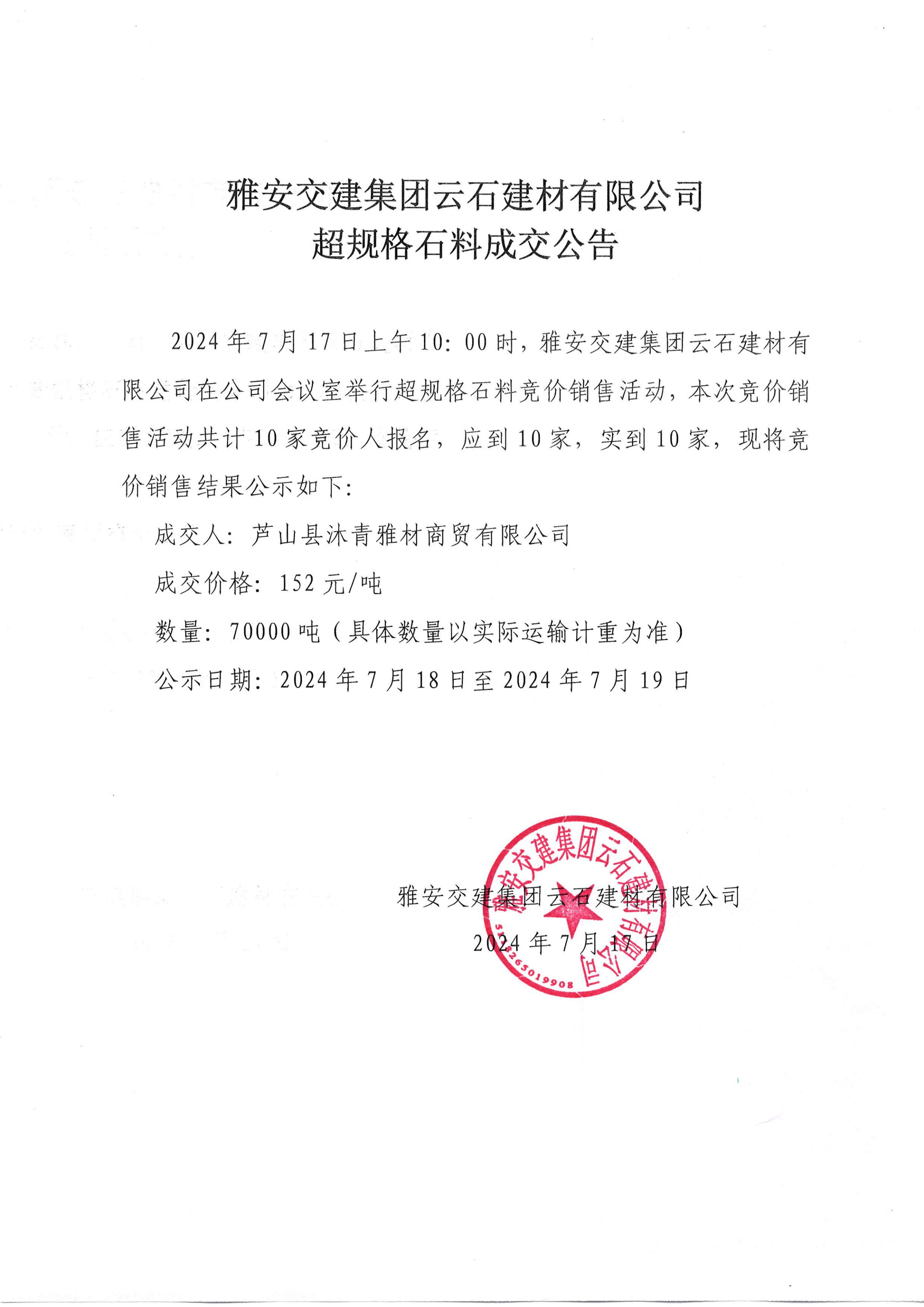 雅安交建集團云石建材有限公司 超規(guī)格石料成交公告(2024.7.17)